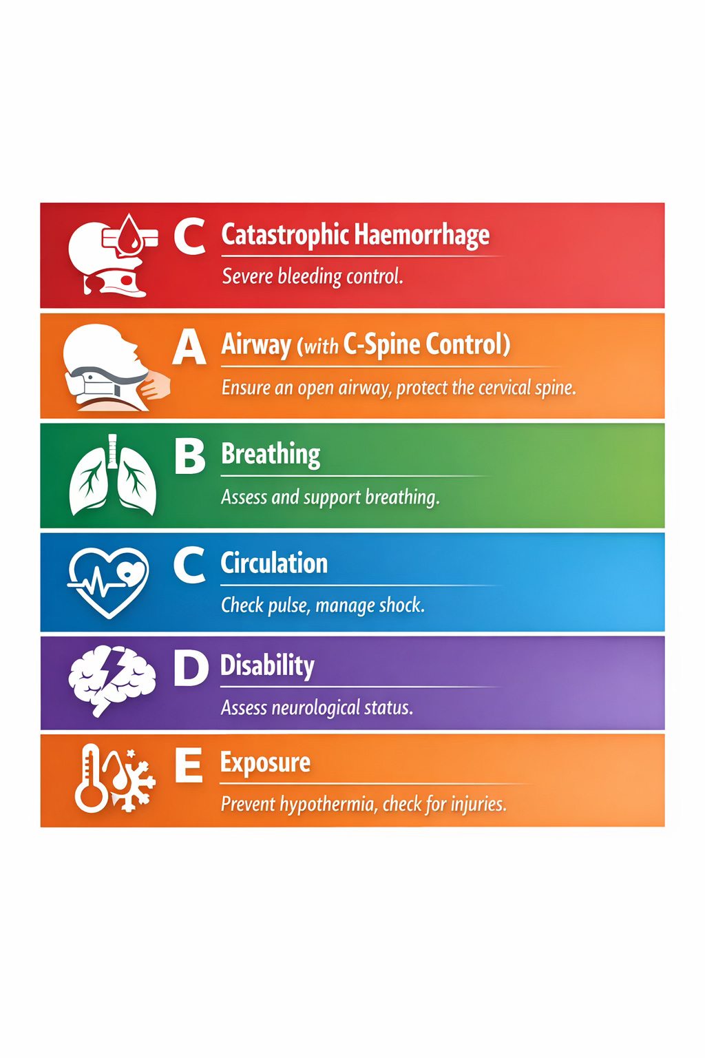 The explicit prioritisation of catastrophic haemorrhage reflects data drawn from trauma and conflict medicine: uncontrolled bleeding remains one of the most rapidly fatal yet preventable causes of death.